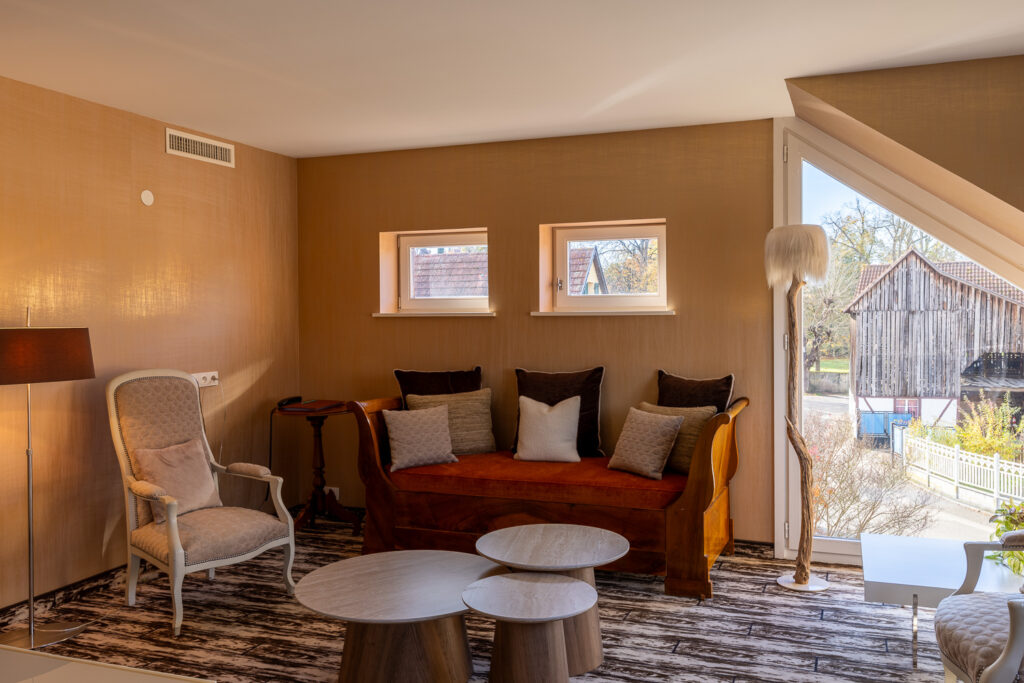 Nos suites lumineuses disposent d’un coin salon, une vue dominante sur le jardin et le clocher de l’église.